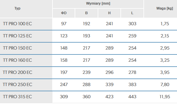 Wentylatory kanałowe o przepływie mieszanym serii TT PRO wykorzystywane są w nawiewno-wywiewnych systemach wentylacji, które wymagają stosunkowo wysokiego sprężu, silnego strumienia powietrza oraz niskiego poziomu hałasu. Zastosowanie silników EC redukuje zużycie energii o 35%. Są znakomitym rozwiązaniem do instalacji budynków indywidualnych, zbiorowego zamieszkania oraz użyteczności publicznej. Wentylatory przystosowane są do transportu powietrza o temperaturze +55°C. Dedykowane są do kanałów wentylacyjnych o średnicach: 100, 125, 150, 160, 200, 250, 315mm.