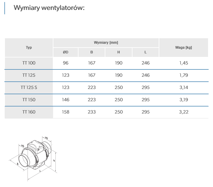 Wentylatory TT posiadają kompaktowe wymiary i możliwość demontażu wirnika wraz z silnikiem bez konieczności ingerencji w system wentylacyjny. Obudowa wentylatora i wirnika wykonana jest z wysokogatunkowego tworzywa sztucznego ABS, które posiada bardzo wysoką trwałość i walory mechaniczne. Blok silnika z wirnikiem oraz skrzynką zaciskową przymocowany jest do obudowy za pomocą specjalnych klamer z zatrzaskami, aby demontaż można było przeprowadzić bez posiadania specjalnych umiejętności i narzędzi. Taka konstrukcja maksymalnie upraszcza obsługę wentylatora. Wszystkie modele, mogą być wyposażone w regulowany wyłącznik czasowy (timer), który umożliwia opóźnione wyłączenie wentylatora po upływie nastawionego czasu zwłoki (2-30 minut).